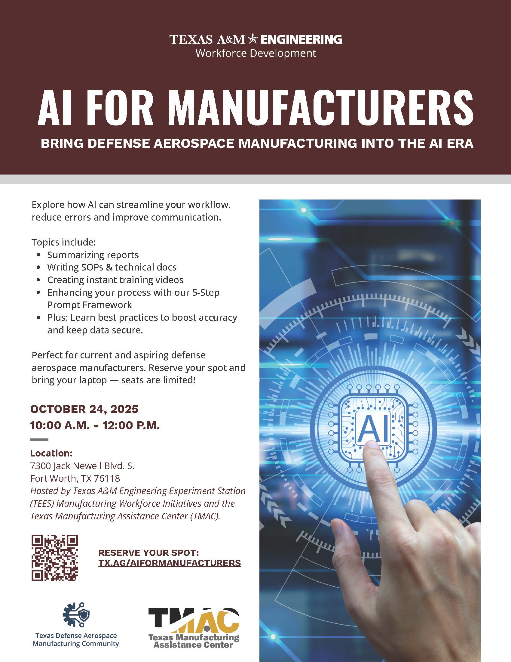 « All Events AI For Manufacturers: BRING DEFENSE AEROSPACE MANUFACTURING INTO THE AI ERA October 24 @ 10:00 am – 12:00 pm TMAC Metroplex UTARI 7300 Jack Newell Blvd. S. Fort Worth, TX 76118 United States + Google Map Register Add to calendar Google Calendar iCalendar Outlook 365 Outlook Live