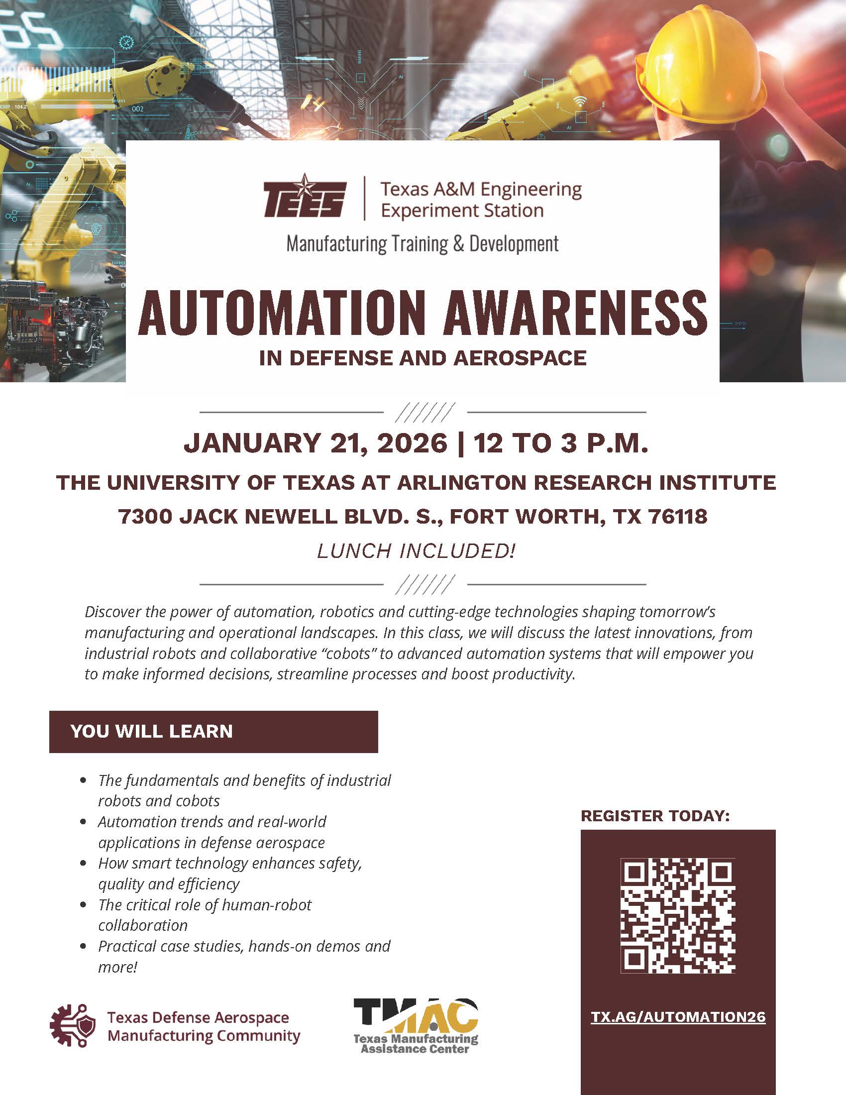 « All Events Automation Awareness: In Defense and Aerospace January 21 @ 12:30 pm – 3:00 pm TMAC Metroplex UTARI 7300 Jack Newell Blvd. S. Fort Worth, TX 76118 United States + Google Map Register Add to calendar Google Calendar iCalendar Outlook 365 Outlook Live