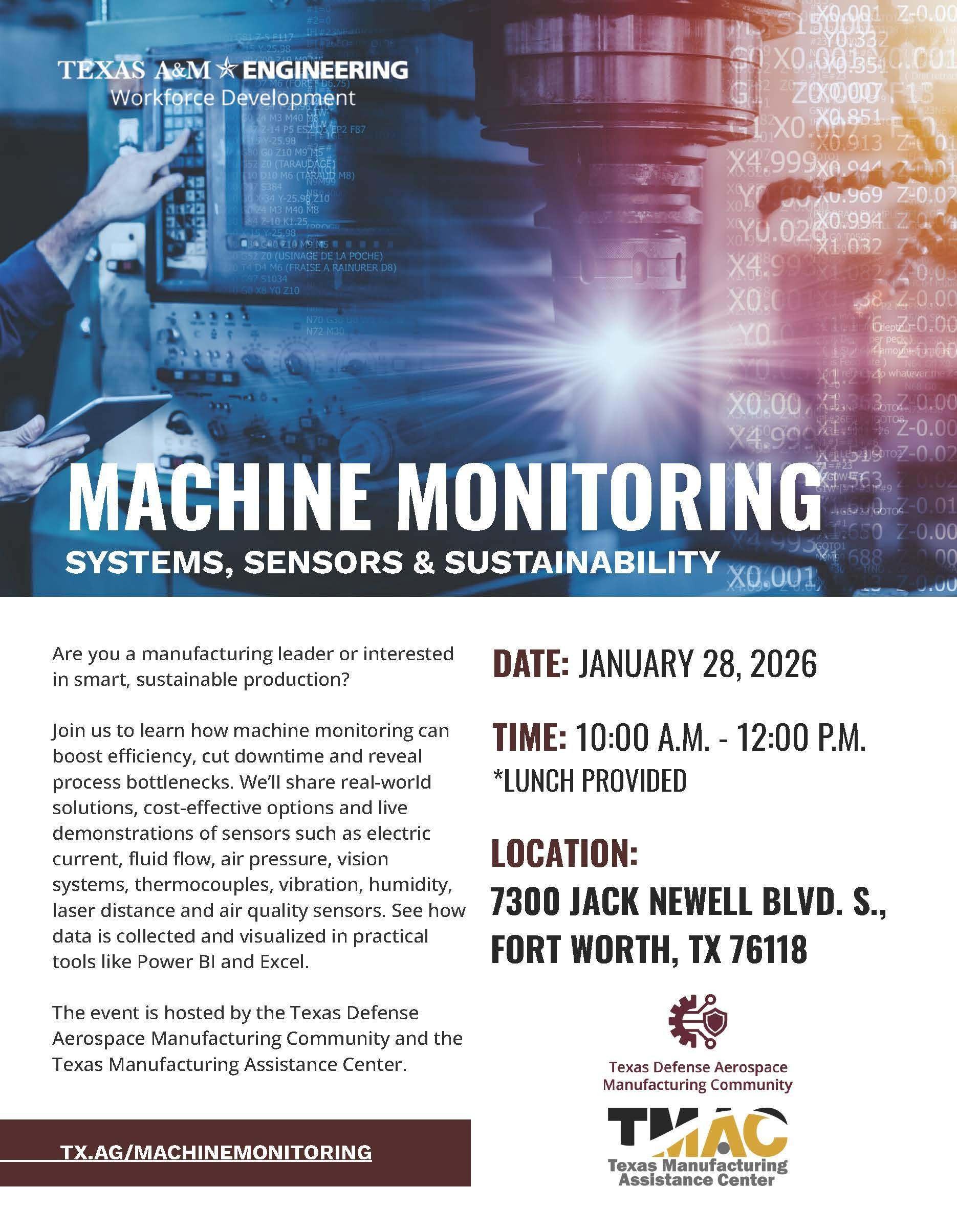 « All Events Machine Monitoring: Sensors, Systems, & Sustainability January 28 @ 10:00 am – 12:00 pm TMAC Metroplex UTARI 7300 Jack Newell Blvd. S. Fort Worth, TX 76118 United States + Google Map Register Add to calendar Google Calendar iCalendar Outlook 365 Outlook Live