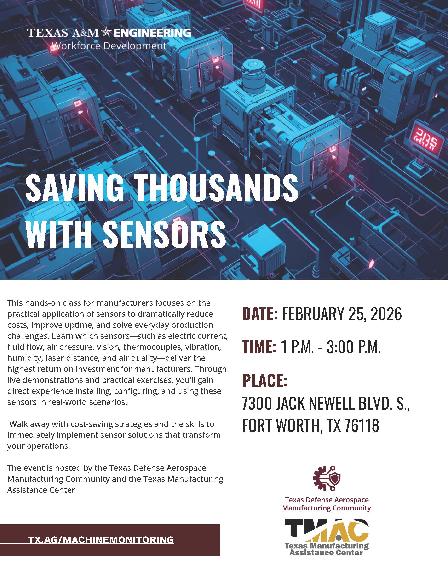 « All Events Savings Thousands with Sensors February 25 @ 1:00 pm – 3:00 pm TMAC Metroplex UTARI 7300 Jack Newell Blvd. S. Fort Worth, TX 76118 United States + Google Map Register Add to calendar Google Calendar iCalendar Outlook 365 Outlook Live